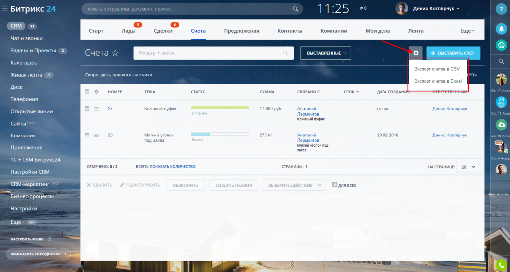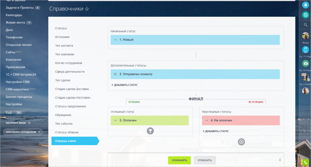 В этом случае счёт прошел через три статуса - Новый, Отправлен клиенту и Оплачен.