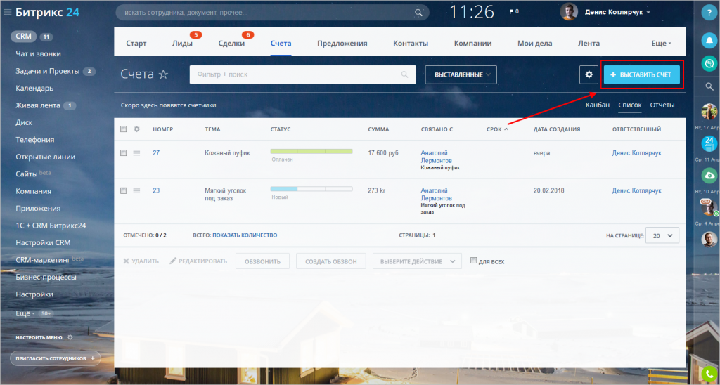 Предлагаем вам к просмотру вводный видеоурок, в котором покажем, как настраивать счета в Битрикс24. В Битрикс24 счёт - финальный этап процесса продаж. Когда сделка заключена, мы создаём счет и выставляем его клиенту для оплаты.