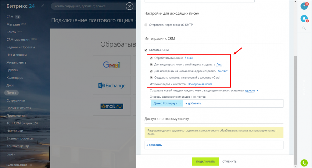 По умолчанию, входящие письма станут лидами, исходящие – контактами.