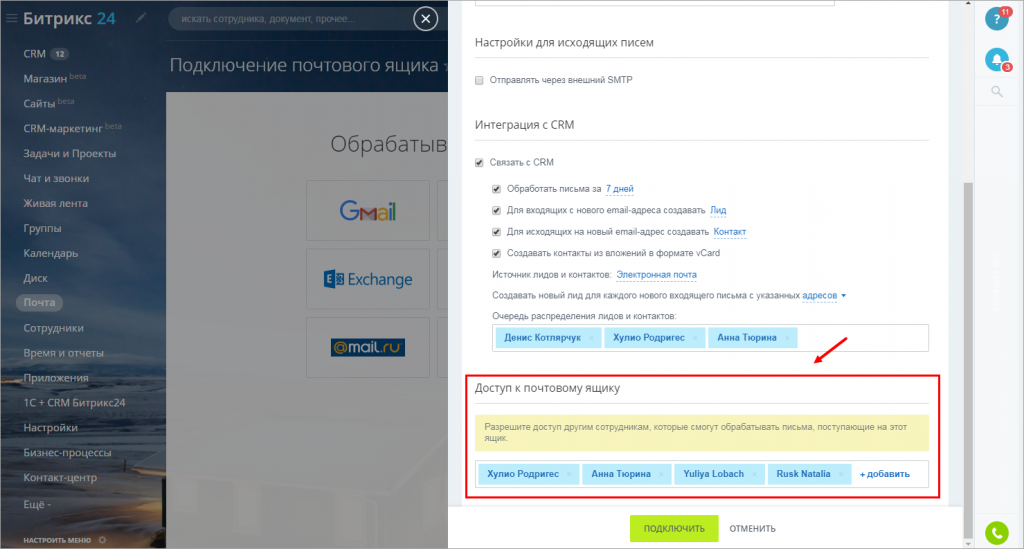 Выберем сотрудников, которые смогут обрабатывать письма (читать, писать, удалять) в этом ящике. В нашем случае – все менеджеры отдела продаж.
