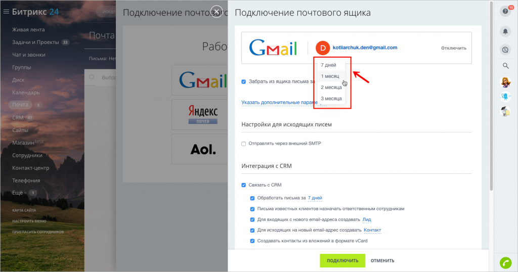 Выберем элементы CRM и срок, за который нужно обработать почту.